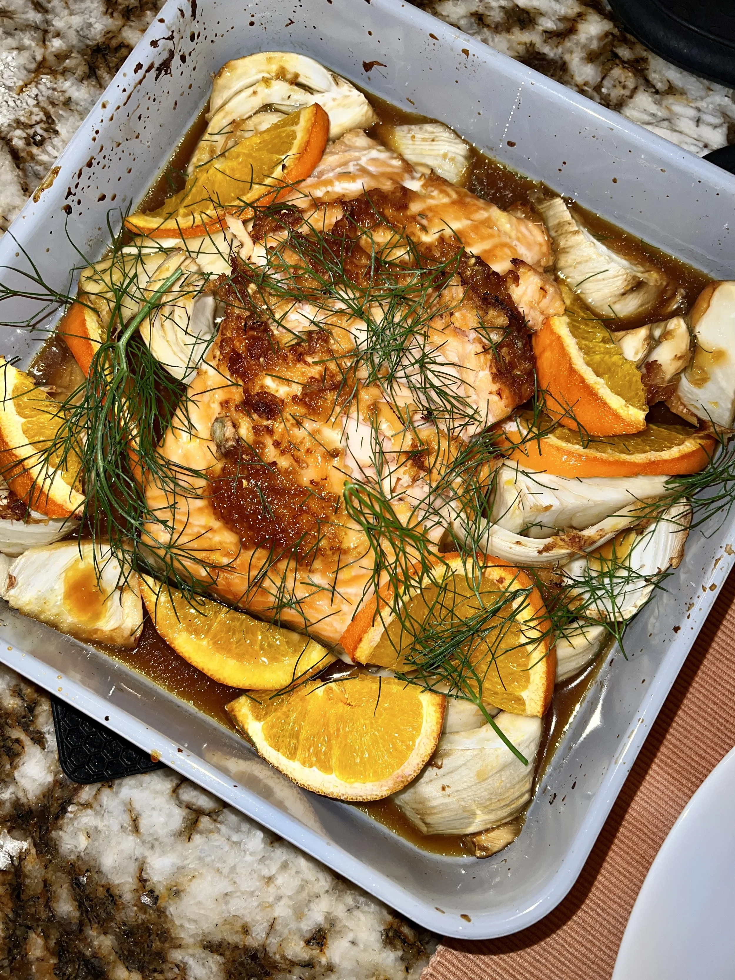 Preheat oven to 275 degrees. In a shallow baking pan just large enough to fit salmon in a single layer, spread out fennel slices, half of citrus slices.